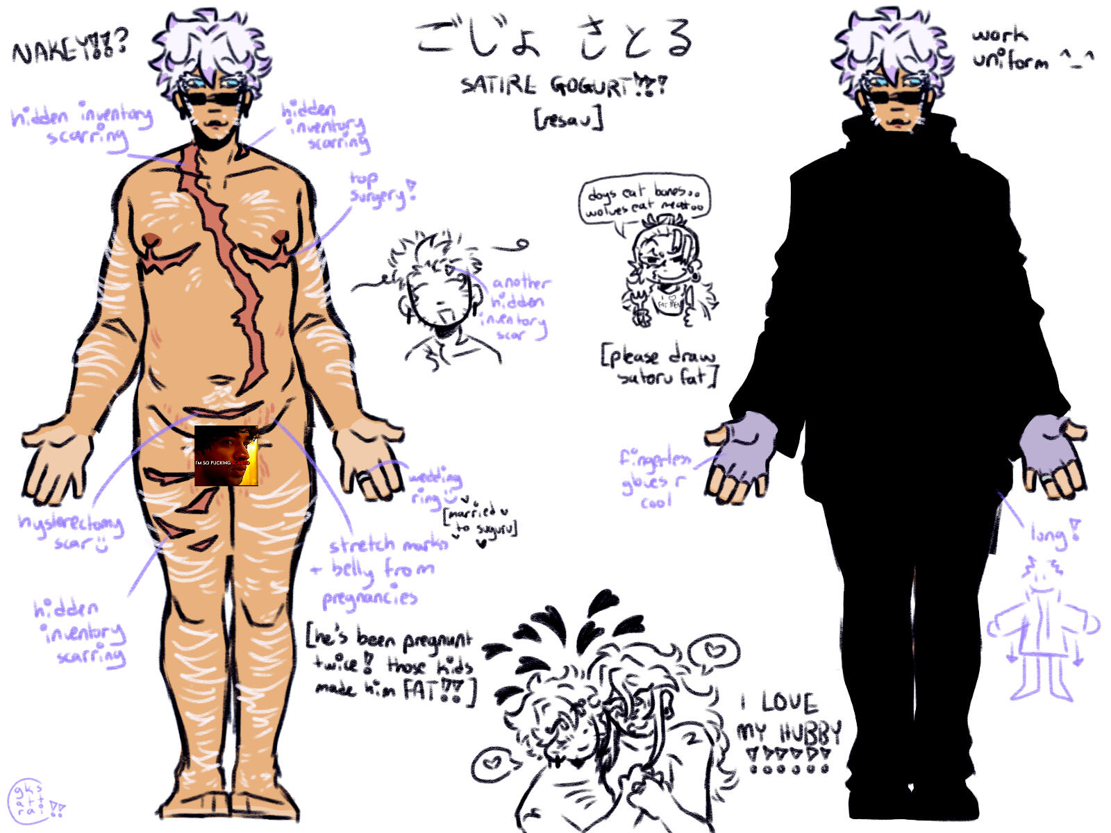 âžµ this was implied earlier, but SATORU GOJO was pregnant twice with YUMEMI GOJO and HOTARU GETO. since DRACOBRELLA [SATORU x SUGURU] weren't married and didn't switch up their names when they got married, their children's last names were chosen manually by their parents. SUGURU insisted YUMEMI have SATORU'S last name, and SATORU insisted HOTARU have SUGURU'S.